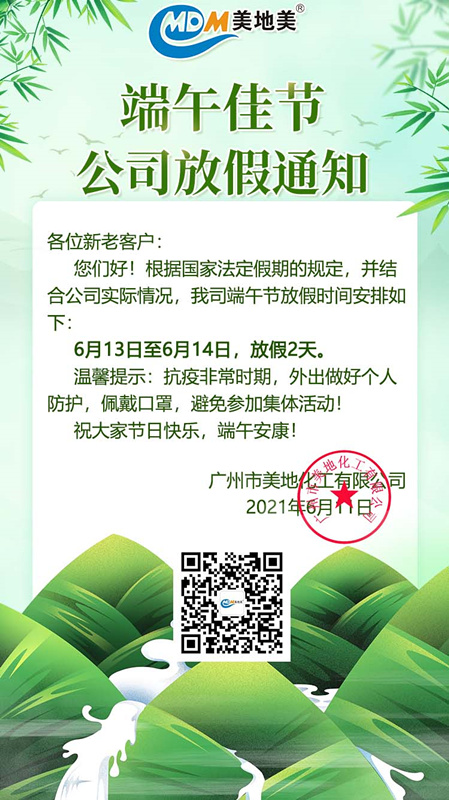 即將迎來端午佳節,廣州市美地化工有限公司現就2021年端午節放假安排通知如下:2021年6月13日至6月14日放假,共2天。節日期間,希望大家提高防范意識,加強自我防護。出行期間佩戴好口罩,勤洗手,盡量減少外出逗留時間,少去人員密集場所,并準備好健康碼,積極配合查驗和體溫檢測等工作。