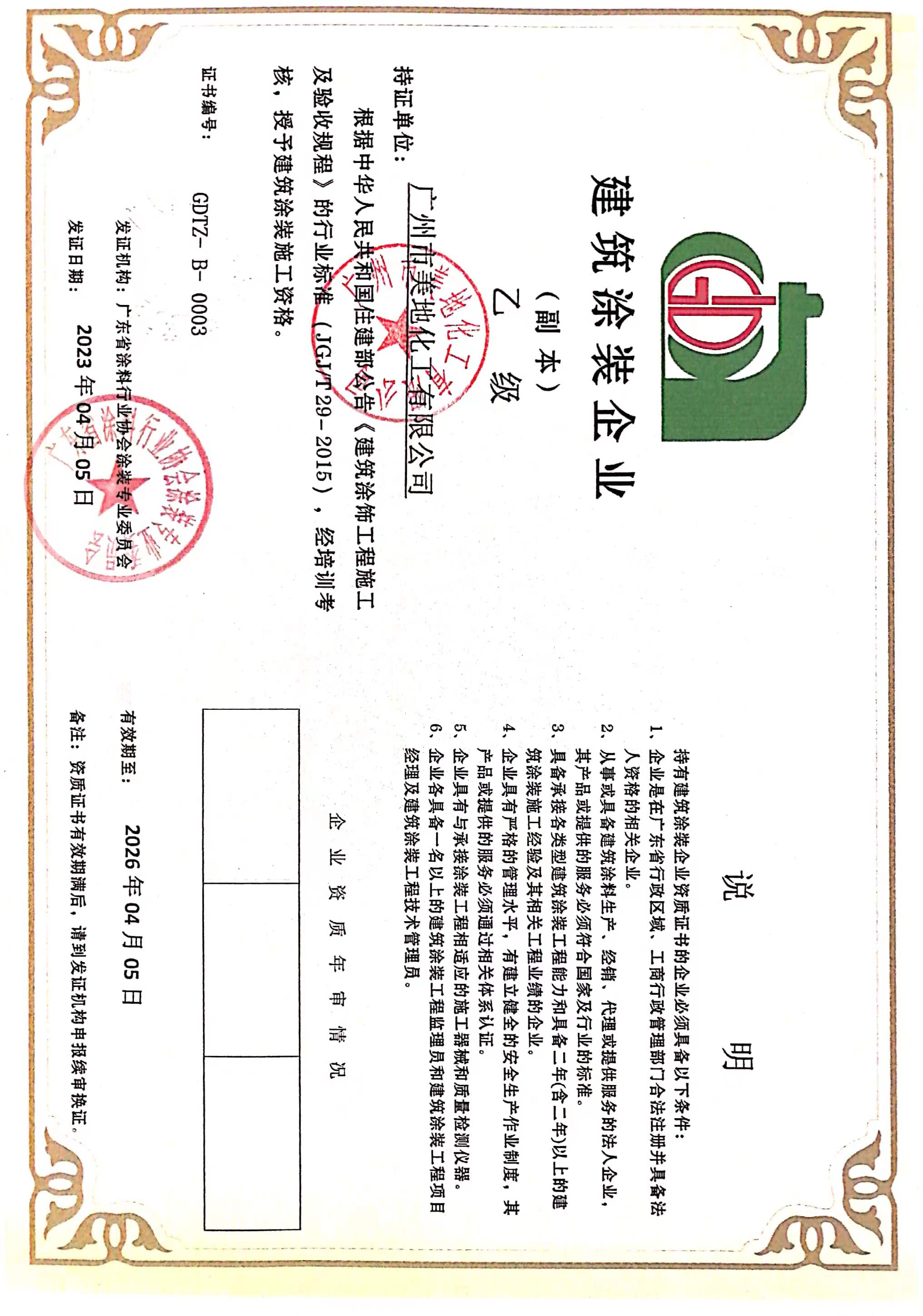 廣州美地于2017年4于5日榮獲建筑涂裝企業(yè)乙級資質(zhì)證書,證件編號:GDTZ-B-0003.此次證書的獲得表明美地美地坪漆公司成為了廣東省涂料行業(yè)內(nèi)具有建筑行業(yè)裝修資質(zhì)和安全聲場許可證的地坪漆廠家。